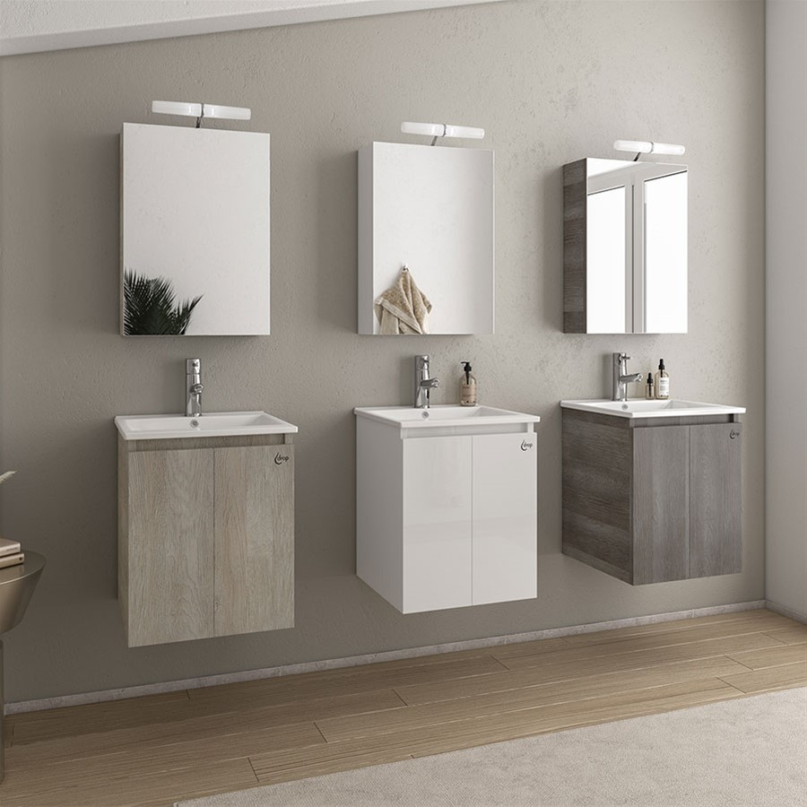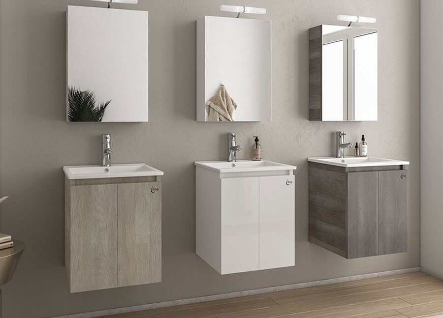 Κρεμαστή βάση,νιπτήρας πορσελάνινος και καθρέφτης κρυφοντούλαπο.