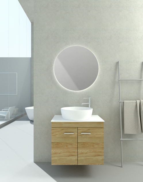 Βάση κρεμαστή 60χ46 εκ.με solid τάβλα και επιτραπέζιο νιπτήρα Φ46 εκ.,καθρέφτη led Φ60 εκ.με πίσω φωτισμό.