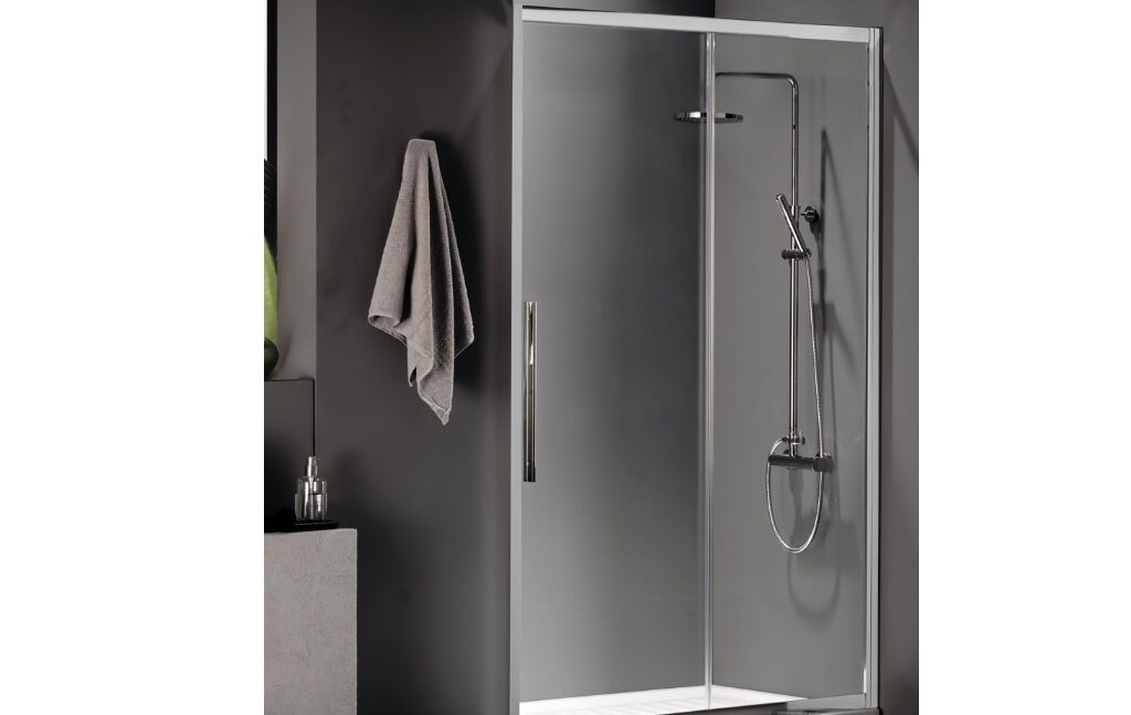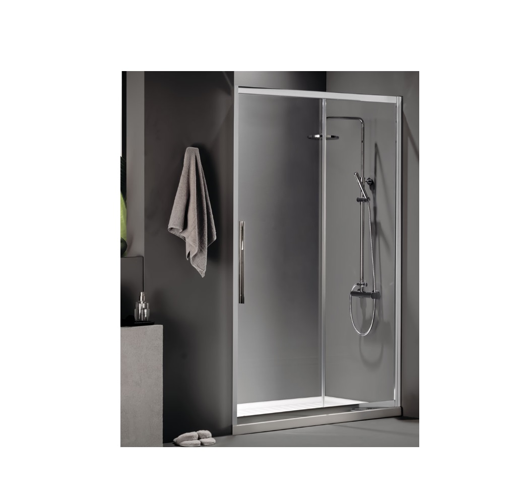 Πόρτα ντουζιέρας 110 με 1 σταθερό & 1 συρόμενο φύλλο. Διαστάσεις: 107-111 / ύψος 220 εκ. άνοιγμα εισόδου 45 εκ. Κρύσταλλο ασφαλείας Clear (διαφανές) 6 χιλ. με επεξεργασία Clean Glass.