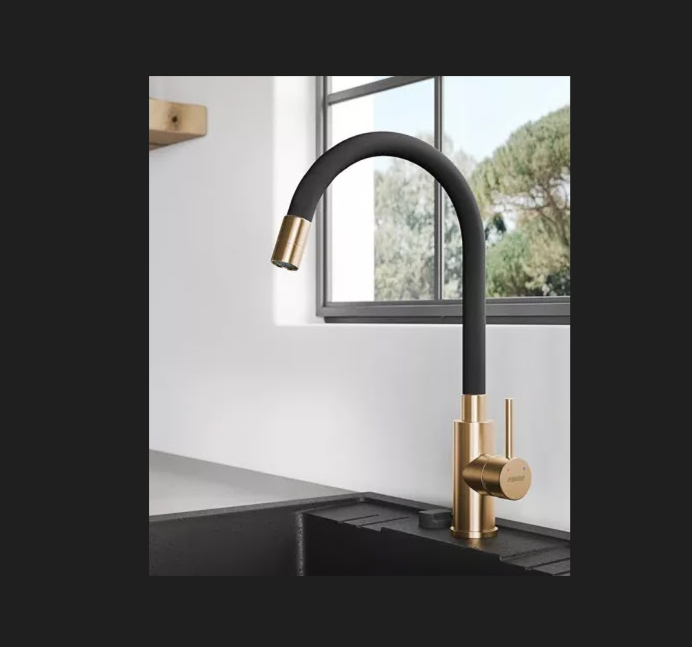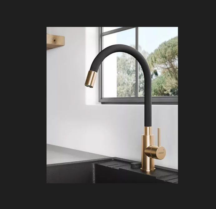 ΜΟΝΟ 90€ Μπαταρία κουζίνας υψηλή, με εύκαμπτο ρουξούνι μαύρο με χρυσό. Σώμα από ανοξείδωτο ατσάλι. Ύψος 35 εκ., προβολή 15-35εκ.