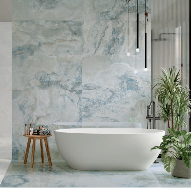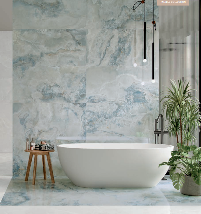 Γρανιτοπλακάκι 60X120 SC.SOFT WHITE RETTIFICATO σε συνδυασμό με blue γυαλιστερό τύπου μάρμαρο .